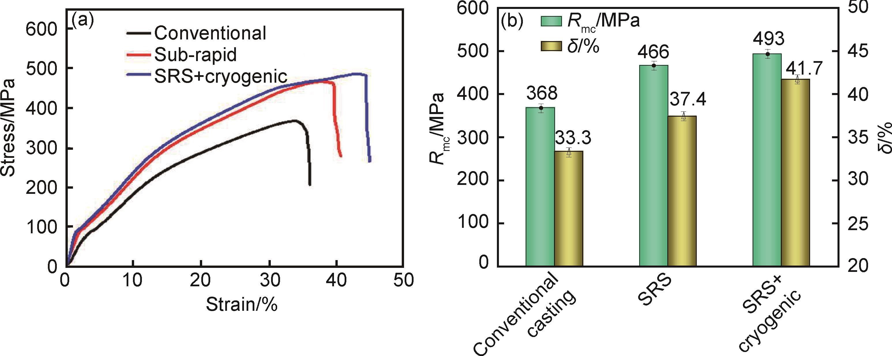 利用亚快速凝固与深冷协同调控Mg-5Al-0.2Ag合金凝固组织,研究了实验合金组织结构及其力学性能提升机制。结果表明,经亚快速凝固后,Mg-5Al-0.2Ag合金获得了晶粒尺寸仅有25 μm,分布着较高密度“Al溶质团簇”、具有较高固溶量的近单一固溶体结构组织,其抗压强度较常规铸造提升了26.6%。进一步深冷处理后,由于所激发孪晶对基体组织分割所产生的结构细化以及孪晶界、纳米析出相对位错运动的阻碍作用,使得Mg-5Al-0.2Ag合金的抗压强度高达493 MPa且保持良好的塑性(压下率为41.7%),即同时增强增塑。