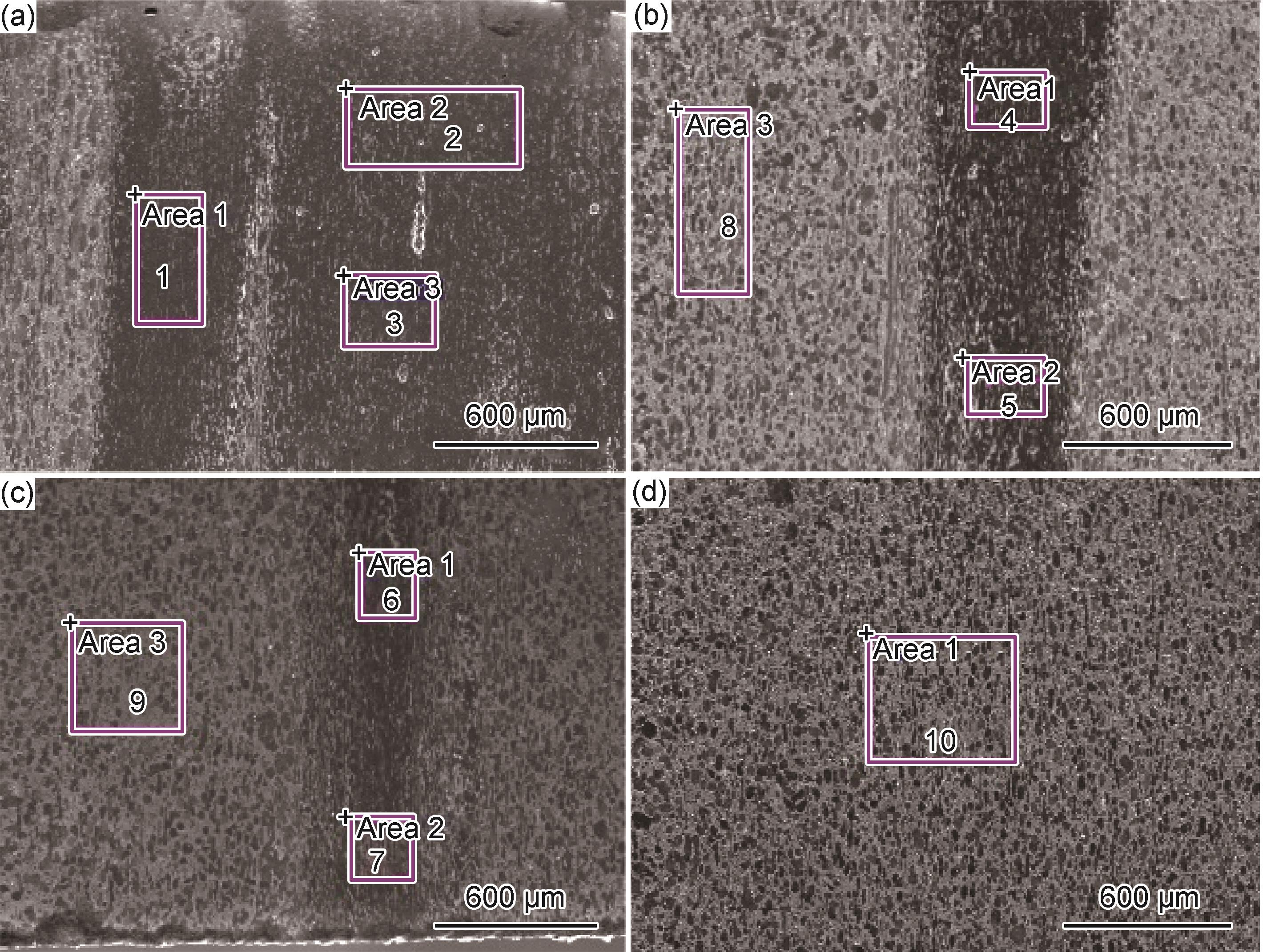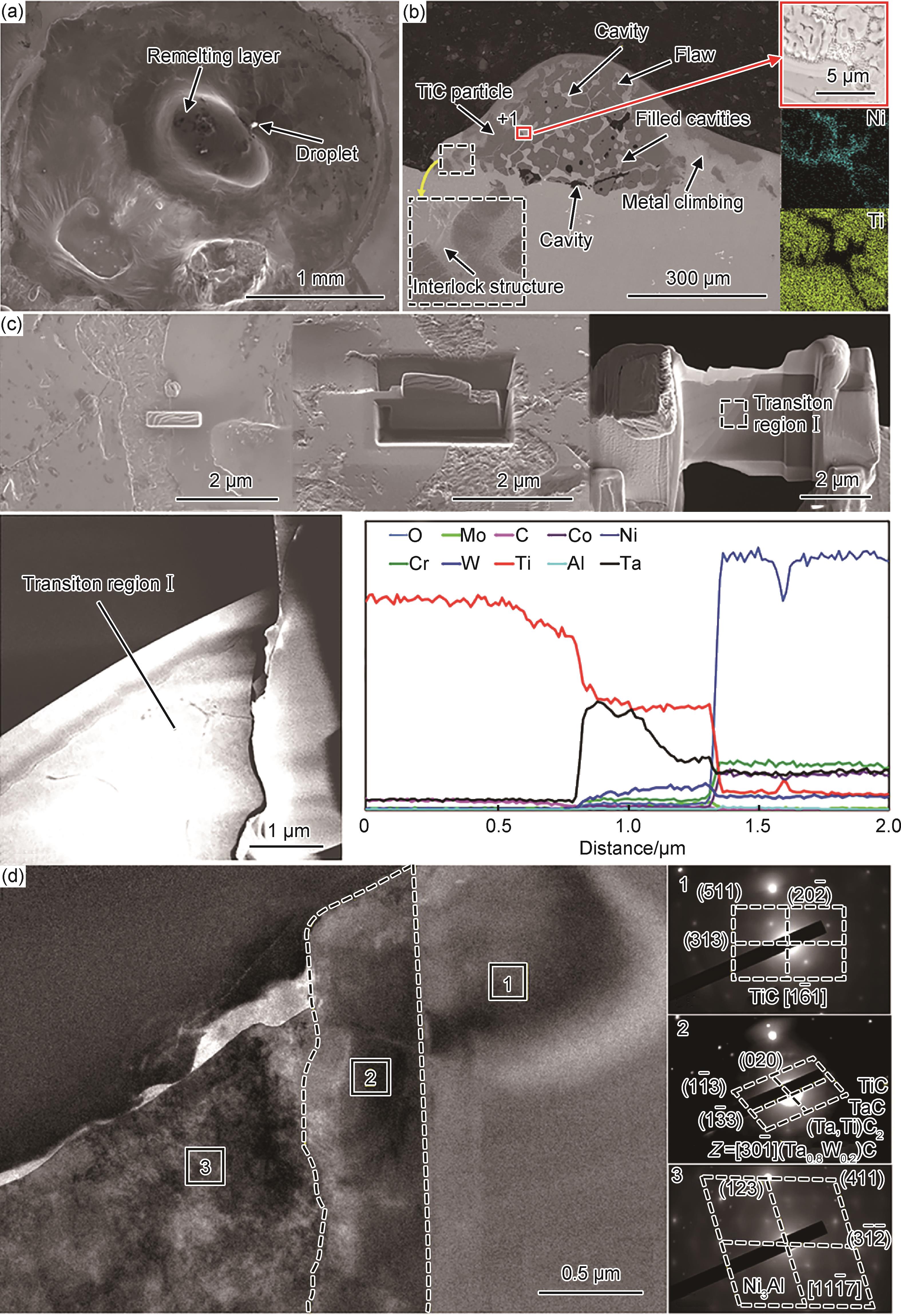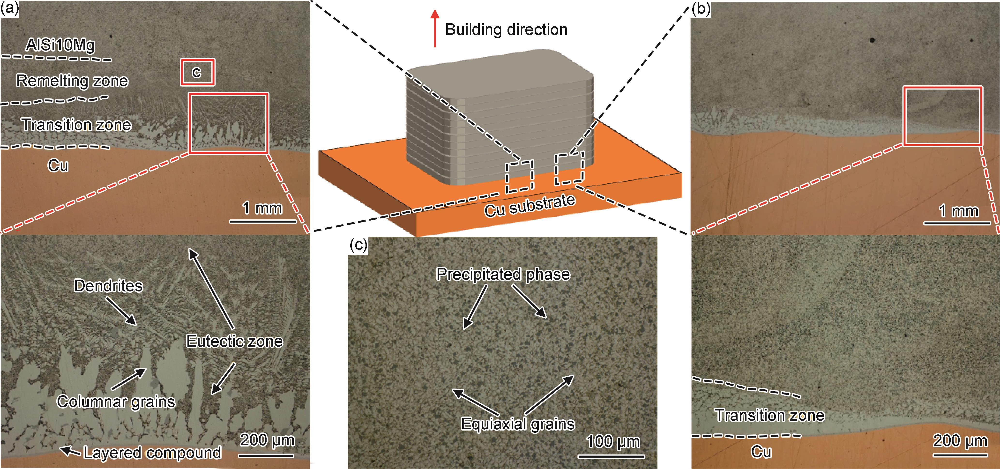Cu/Al复合材料兼备Cu的高导电性和Al的低密度等优点,已用于航空航天、电子等重要工业领域,但实现二者有效冶金连接存在一定难度。本研究采用激光定向能量沉积(L-DED)技术在T2紫Cu基材上沉积AlSi10Mg得到Cu/Al复合材料。结果表明:无预热条件下样品界面高残余应力和超过300 μm的化合物层导致严重裂纹缺陷,通过预热基材成功消除了界面裂纹,并实现致密冶金结合。预热下样品Cu/Al界面存在γ-Al4Cu9、η-AlCu和θ-Al2Cu三种Cu/Al金属间化合物。根据显微组织形貌发现,Cu/Al界面形成了过渡区和重熔区,过渡区底部为层状γ相和η相,上方主要为Cu/Al过共晶产生的初生θ相和共晶区,组织演变为:Cu→(Si)+γ→η→α-Al+Si+θ→Si+(α-Al+θ)+θ→(α-Al+θ+Si)+(α-Al+θ)+θ→Si+(α-Al+θ)+α-Al;重熔区组织为Si+(α-Al+θ)+α-Al,Si在Cu/Al界面主要形成初生相,在过渡区顶部与Al、Cu形成共晶组织。预热样品不同区域维氏显微硬度呈现:过渡区>重熔区>AlSi10Mg区>Cu基材。