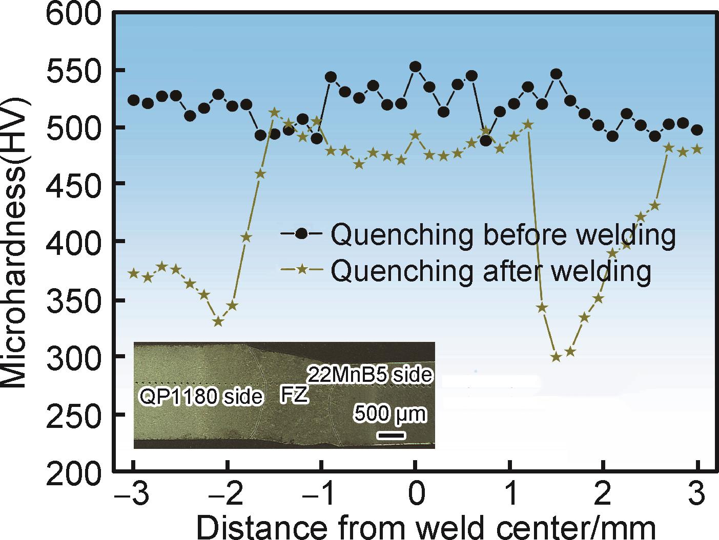 QP1180淬火-配分钢和22MnB5热冲压成形钢是两种主要的汽车轻量化材料,QP1180是1.2 GPa的冷成形钢,而22MnB5是1.5 GPa的热冲压成形钢,该钢需经过热冲压才能获得高强度。汽车制造中经常采用这两种材料并进行连接。为研究这两种超高强度钢板的焊接接头性能,采用将QP1180与22MnB5先激光拼焊再热成形淬火以及先将22MnB5热成形淬火再进行激光拼焊两种方式,通过体式显微镜、扫描电子显微镜、单向拉伸实验和维氏硬度测试等手段,对比先淬火热成形再焊接及先焊接再热成形淬火激光拼焊接头组织和性能差异。结果表明:先激光拼焊再热成形淬火的接头与先热成形淬火再激光拼焊的接头相比,前者焊接接头抗拉强度较后者抗拉强度提高了20.7%,断后伸长率提高了90.3%,硬度提高了140%,焊接接头两侧未出现软化现象,软化区组织从原来的马氏体+铁素体转变为细小的马氏体,抗拉强度、断后伸长率和硬度均比焊前热成形淬火时有所提高,这些性能的提高可提升构件的成形性和使用性。