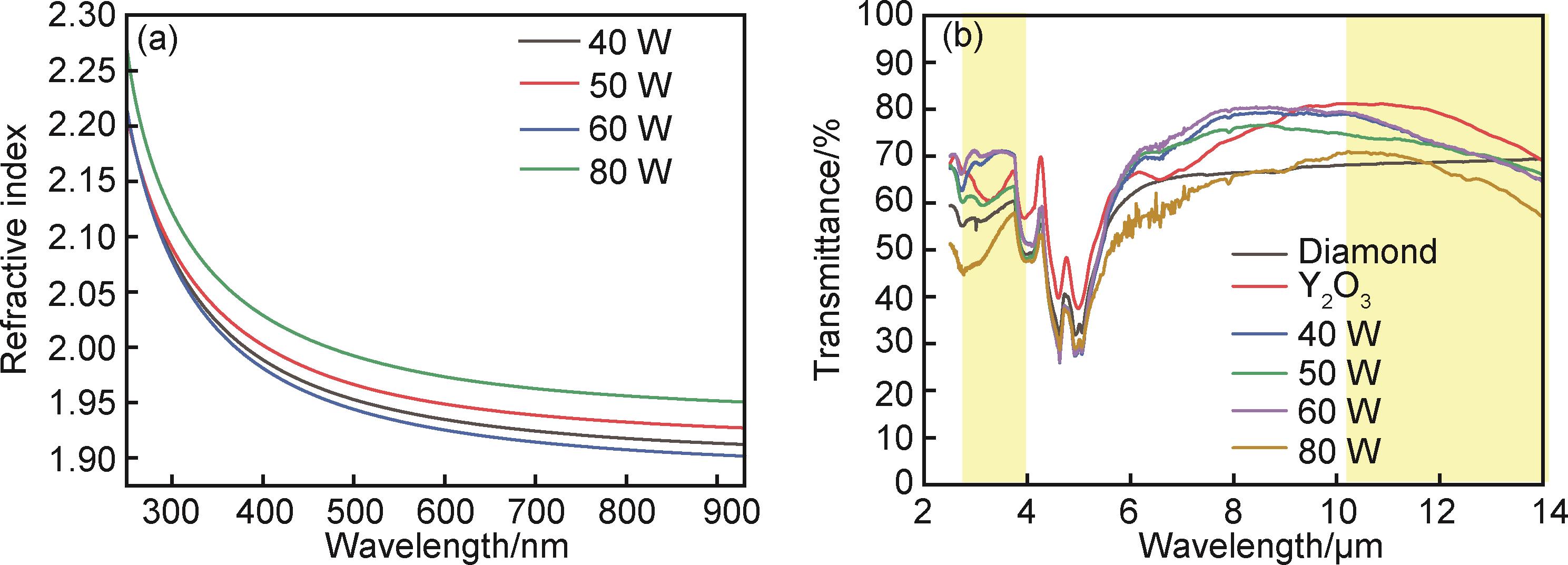 元素掺杂可以改变基体材料的结构,从而提高材料的性能。利用磁控溅射法在单晶硅和多晶CVD金刚石上分别制备未掺杂及Zr掺杂Y2O3薄膜,研究Zr掺杂氧化钇(Y2O3)增透薄膜的组成、结构及性能。掠入射X射线(GI-XRD)测试结果表明,未掺杂的Y2O3薄膜呈现立方(222)面柱状晶体取向,随着Zr掺杂功率增加,新的单斜Y2O3相(111)晶面取向开始出现。扫描电镜(SEM)观察结果表明,不同Zr掺杂功率下Y2O3薄膜呈现柱状晶结构,结晶质量较好。原子力显微镜(AFM)结果证实,与未掺杂的Y2O3薄膜相比,Zr掺杂的Y2O3薄膜具有较低的均方根(RMS)粗糙度值。在Zr掺杂的Y2O3薄膜中,随着Zr浓度的增加,柱状晶的晶粒尺寸显著减小。X射线光电子能谱(XPS)结果表明,金属Zr与O相互作用,以Zr-O化合物形式存在于Y2O3薄膜中。在8~12 μm的长波红外范围内,Zr掺杂的Y2O3/金刚石薄膜最大透过率提升了19.7%,3~4 μm中波红外范围内最大透过率提升了25.9%。颗粒细小的Zr掺杂Y2O3薄膜具有较高的硬度和弹性模量,其硬度和弹性模量分别增加了5.3 GPa和33.9 GPa。