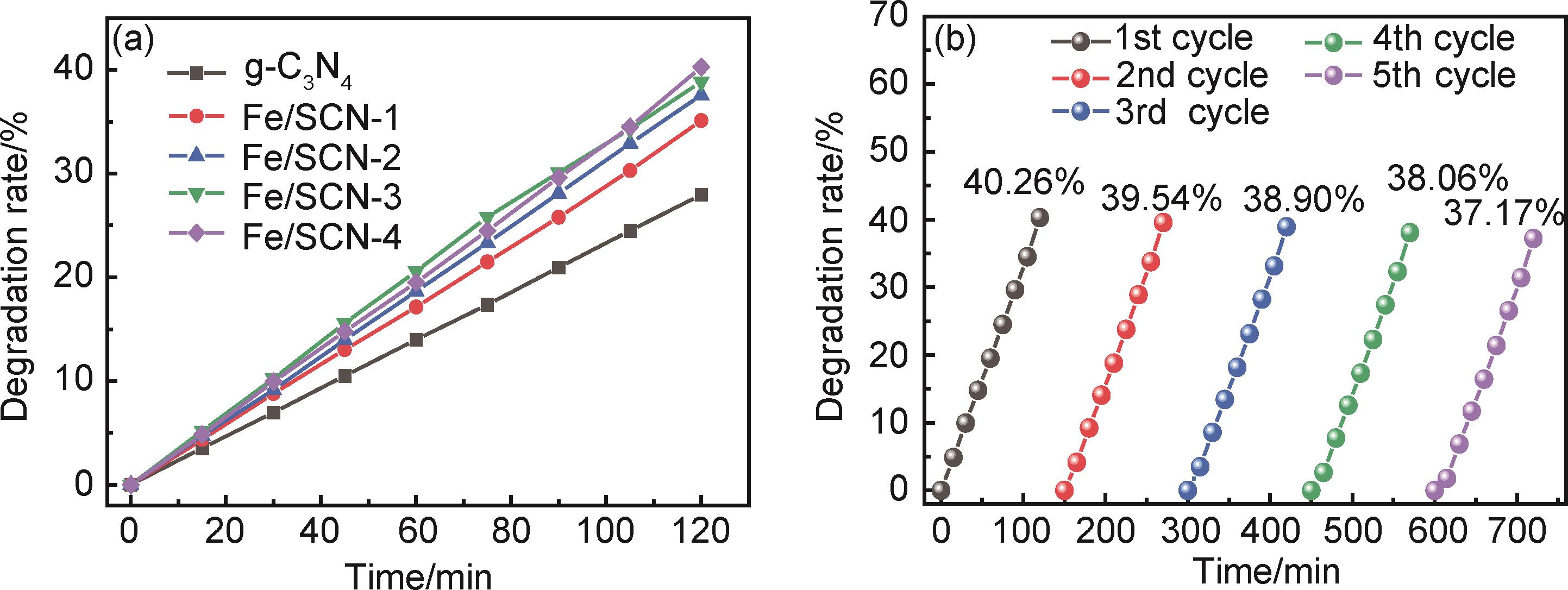 光催化技术因其成本低、可回收、对环境友好等优点受到研究人员的广泛关注,但纯光催化材料的光催化性能存在一定的缺陷,如电子-空穴对复合率高、光响应范围小等,因此在实际应用中常对其进行改性处理。为了增强石墨相氮化碳(g-C3N4)在可见光条件下对NO的降解性能,以三聚氰胺、硫脲和硝酸铁为原料,通过热聚合法制备得到Fe/S共掺杂改性g-C3N4产物Fe/SCN。结果表明,Fe/S共掺杂会破坏g-C3N4的三嗪环结构,导致g-C3N4内部N—H键的伸缩振动消失,Fe、S元素主要以Fe—N和Fe—S共价键形式存在;同时,Fe/S共掺杂可以增大g-C3N4的比表面积、提高光生载流子分离效率、降低电子-空穴对的复合率、提高瞬态电流密度、降低电阻抗,从而提高光催化降解性能。光催化降解NO实验结果表明,Fe/SCN-4在可见光条件下2 h对NO g-C3N4的降解率可达到40.26%,且经过5次循环后的降解率为37.17%,证明Fe/S改性后具有良好的降解性能和循环稳定性。