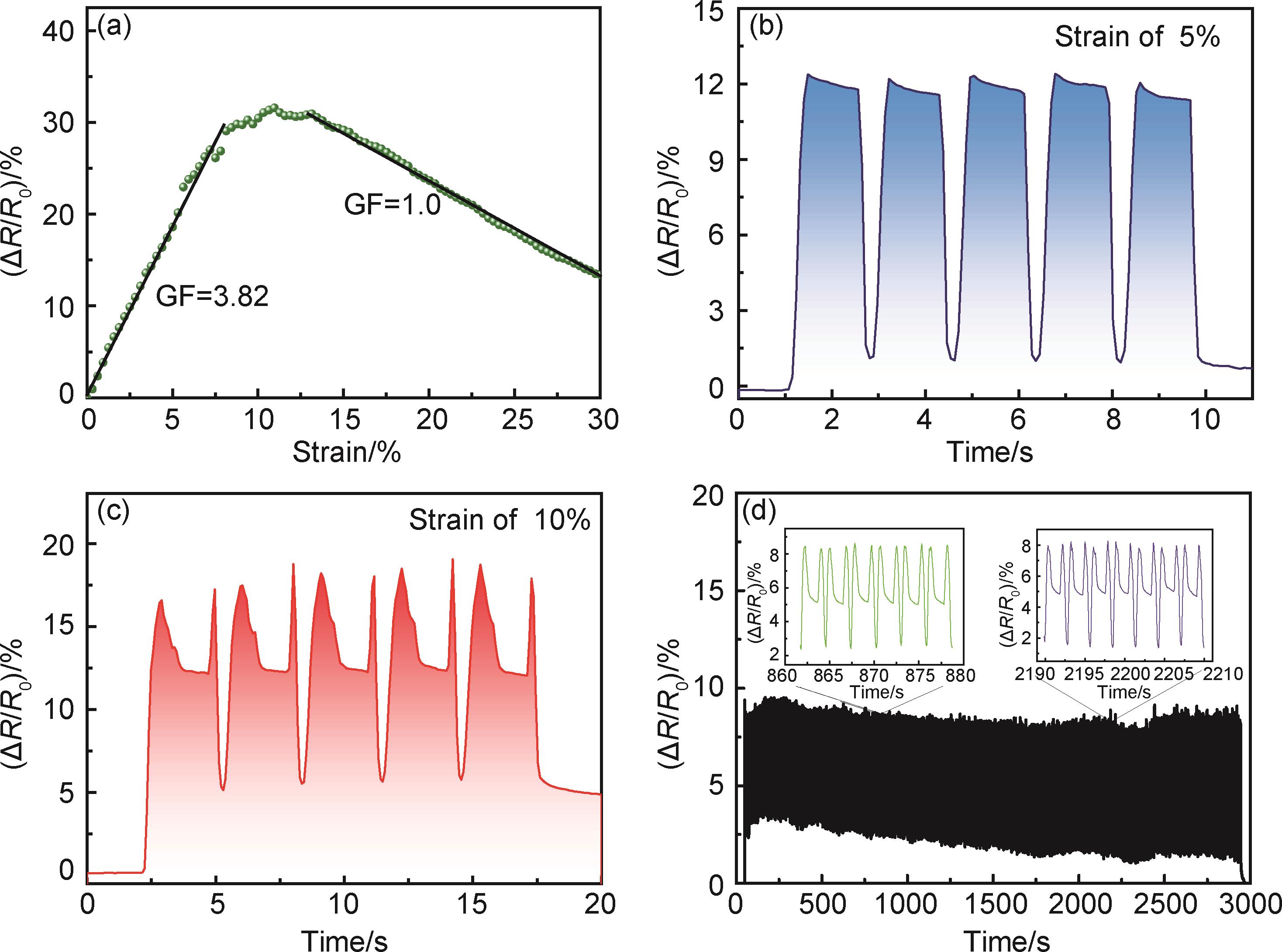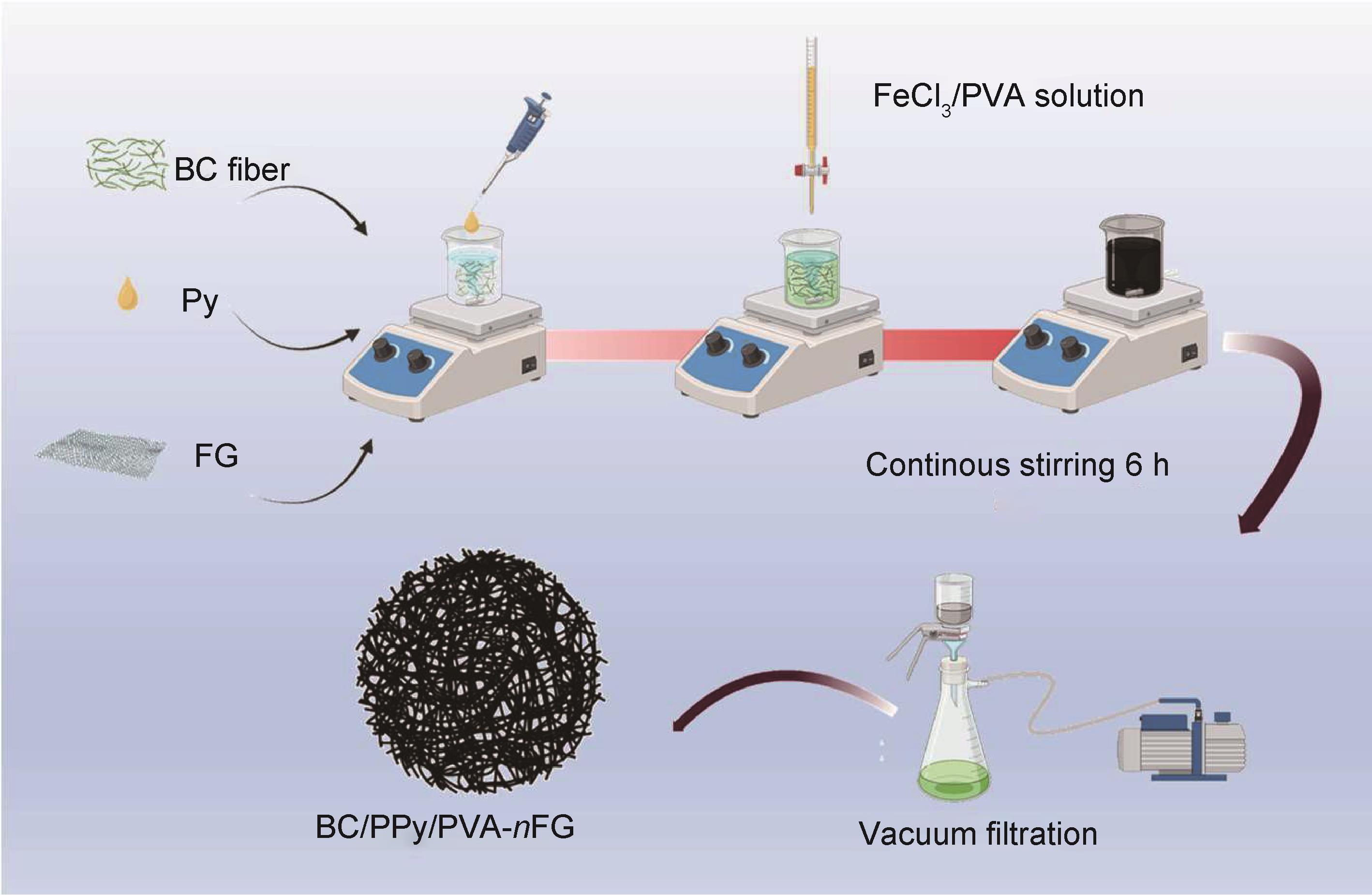 细菌纤维素(BC)基柔性导电膜材料,凭借卓越的力学性能、优异的生物兼容性及其环境友好的加工技术,已成为当前研究的热点。BC基柔性导电膜材料具有三维网孔结构,纤维上含有大量的羟基,该结构特征导致水分子在渗透到导电材料中时易与纤维上羟基形成结合水,从而对电荷传输产生不利影响。为了改善这一问题,本研究采用原位聚合法和真空抽滤技术制备了柔性导电复合膜材料(BC/PPy/PVA-nFG)。其中,聚乙烯醇(PVA)用作机械增强组分,聚吡咯(PPy)用作导电介质,而氟化石墨(FG)作为协同导电机制兼疏水组分。通过减少水分子与BC纤维上羟基之间的氢键作用,有效降低了纤维间结合水的含量,从而提高了材料在湿润状态下的电荷传输稳定性。实验数据显示,柔性导电膜材料在未吸水状态下的初始电阻为32 Ω,吸水后溶胀率达53%,电阻上升至47 Ω。该研究表明,通过引入FG纳米片,可以显著提高BC基柔性导电膜材料的电荷传输稳定性能,为开发新一代绿色环保柔性导电膜材料提供了有价值的研究方向。