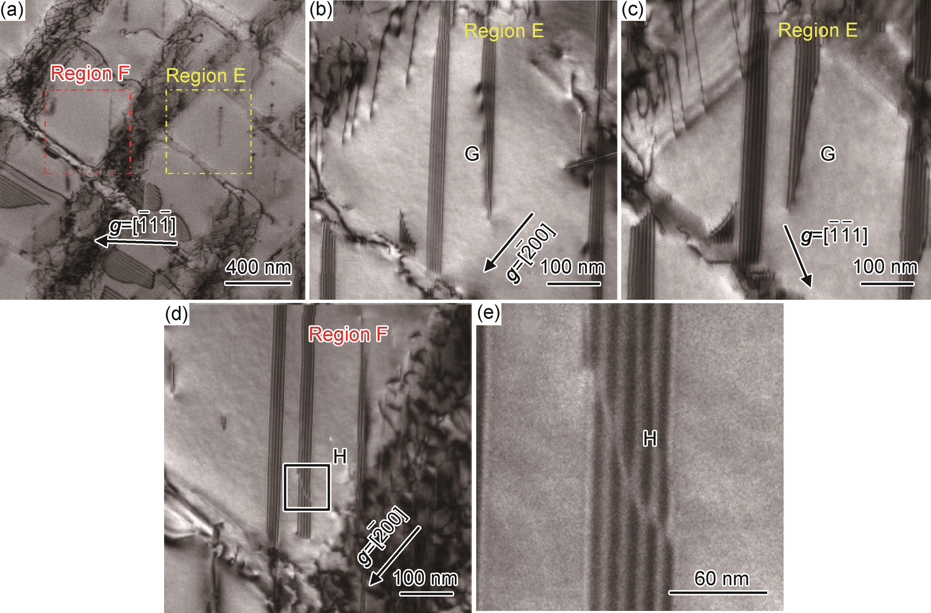通过分析第三代镍基单晶高温合金在760 ℃下的蠕变变形行为,并对其微观组织演变和位错组态进行表征,研究高温合金在760 ℃下的蠕变变形机制。结果表明:在760 ℃下合金蠕变变形机制主要为位错剪切进入γ′相,在蠕变初期,γ′相内位错分解的主要形式为肖克利不全位错+堆垛层错。不同{111}面的堆垛层错可以相互反应,形成Lomer-Cottrell (L-C)位错锁。在蠕变后期,a〈011〉型超位错大量剪切进入γ′相内,超位错可以从{111}面交滑移到{001}面形成具有非平面结构的Kear-Wilsdorf (K-W)锁。合金蠕变过程中,L-C锁和K-W锁的形成阻碍位错运动,使得合金的蠕变抗力获得提高。