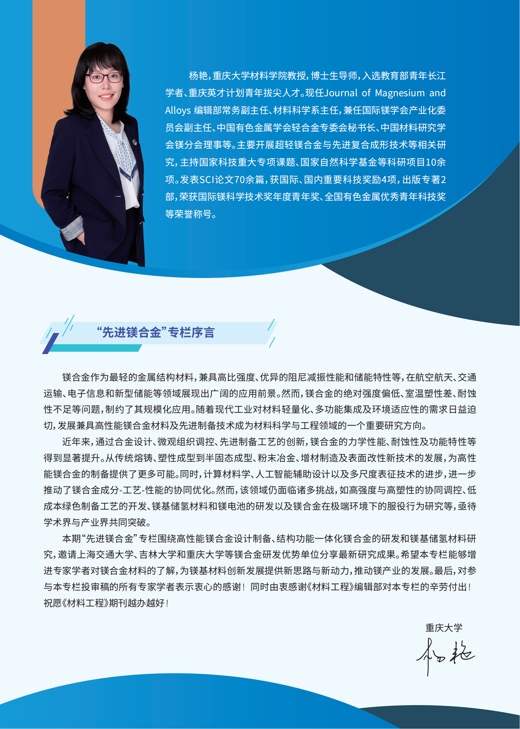 本期“先进镁合金”专栏围绕高性能镁合金设计制备、结构功能一体化镁合金的研发和镁基储氢材料研究,邀请上海交通大学、吉林大学和重庆大学等镁合金研发优势单位分享最新研究成果。希望本专栏能够增进专家学者对镁合金材料的了解,为镁基材料创新发展提供新思路与新动力,推动镁产业的发展。最后,对参与本专栏投审稿的所有专家学者表示表心的感谢!同时由衷感谢《材料工程》编辑部对本专栏的辛劳付出!祝愿《材料工程》期刊越办越好!